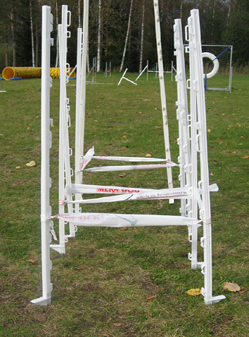 Sedan blev det övningar enligt deltagarnas önskemål. En av deltagarna hade valt genomgång av krypande. Vi såg på filmen som visade det (Tly 3) och där används buskstöd (trädgårdsgrej). Sådana fanns inte på klubben men kreativa nedansiljare fixade en krypgård på sitt sätt med stolpar och plastband. Bra jobbat! Vi jobbade bort pipet på två schäfrar - till förarnas stora glädje. Vi övade vittringen, framförgåendet och rutan med grillpinnen i mitten angivande "belöningsplatsen" och en del annat ... |