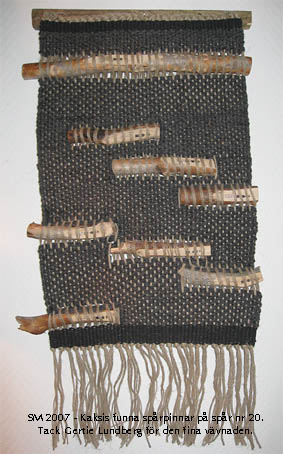 Vi gick åt rätt håll och fann alla pinnarna! Gertie Lundberg har vävt in alla pinnarna! Mycket vackert. TACK! Here are the sticks woven in a mat! | |
