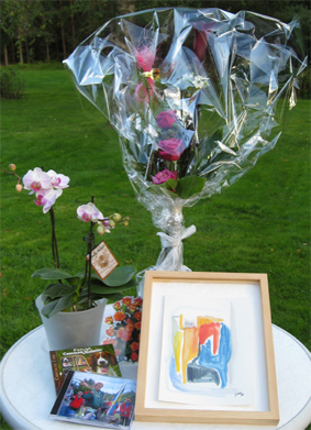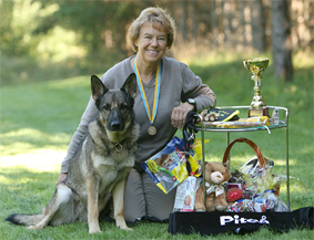 | Här sitter vi vid våra priser och presenter Tack Lena och Sandra för er omtanke! Era presenter var helt i Kaksis smak. Here we are with all our gifts. Thanks! |