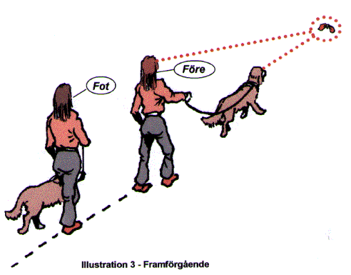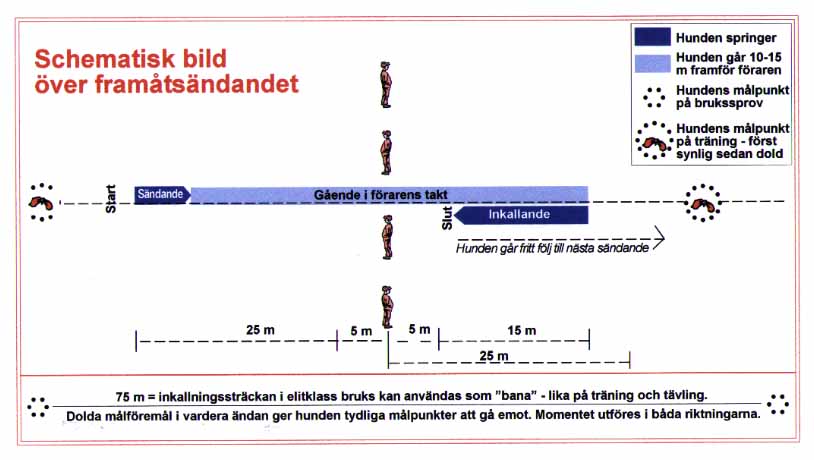 Sending + Gående: Trinn 6: Noen hunder behøver korrigeres negativ for å slutt å lukte. Stopper hunden og lukter kan du ’gå mot/ på hunden bakfra’ så den blir tvinget til å flytte seg. Når du ’støter mot hunden’ si ’foran’ vennlig, som en påminnelse på hva hunden egentlig skal gjøre. Bli ikke sint, la hunden bare merke ubehaget som skjer om den ikke holder seg foran deg i koblets lengde. Går hunden skjevt så gjenta kommandoordet foran samtidig som du med håndtegn og et lett kobbelrykk gjør hunden oppmerksom på at dette er den rette retningen. Gå også lineføring en ganske lang strekke før du sender hunden, så den får retningen i ’beina’.På plass strekningen kan være lengre enn foran streningen ved denne treningen. Trinn 7: Sending + Gående + Avslutning: Trinn 8: Trinn 9: Glem ikke den viktige forstyrrelse treningen. En treningssted er ofte stort hvilket innebærer at hunden ser mye. Tren derfor fremadgående forbi andre hunder og alt annet som forstyrrer hunden din. Når du arrangerer forstyrrelse, få hjelp av medhjelpere ved M-punktet, som kan – etter ditt nei – foran – hjelpe hunden til rett adferd, så du kan belønne i vanlig rekkefølge.