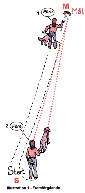 Gå med hunden strekningen S(start) – M(ål) – 25 – 30 meter. Ved M stopper du og er stille. Du titter på målgjenstanden (ikke på hunden) og sier fremad og kaster ut det ca. 5 m. foran dere til M-punktet. Siden fortsetter stillheten og du drar/ går tilbake med hunden til S. Det stiller du hunden - si stå/ bli stående - i retning mot M og stiller deg selv ca. 10 m. bak hunden. Dette er utgangsstillingen ved de første øvelsene. (Om du ikke kan stille deg bak hunden får du la hunden løpe av gårde direkte etter at du har snudd ved startpunktet og sagt fremad) Så sier du fremad og hunden får løpe av gårde mot M.