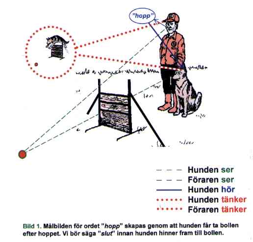 betyr ’det finns en ’lekeball’ på den andre siden av hindret’. Hunden hopper