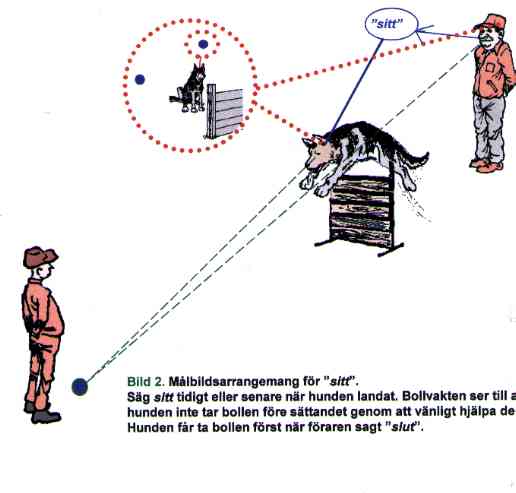 10 meter bak hinderet. Hunden skal nå få ballen, som belønning for ordet