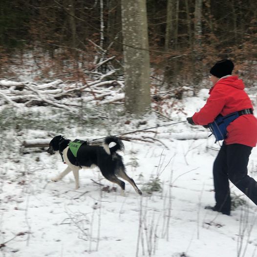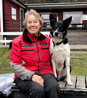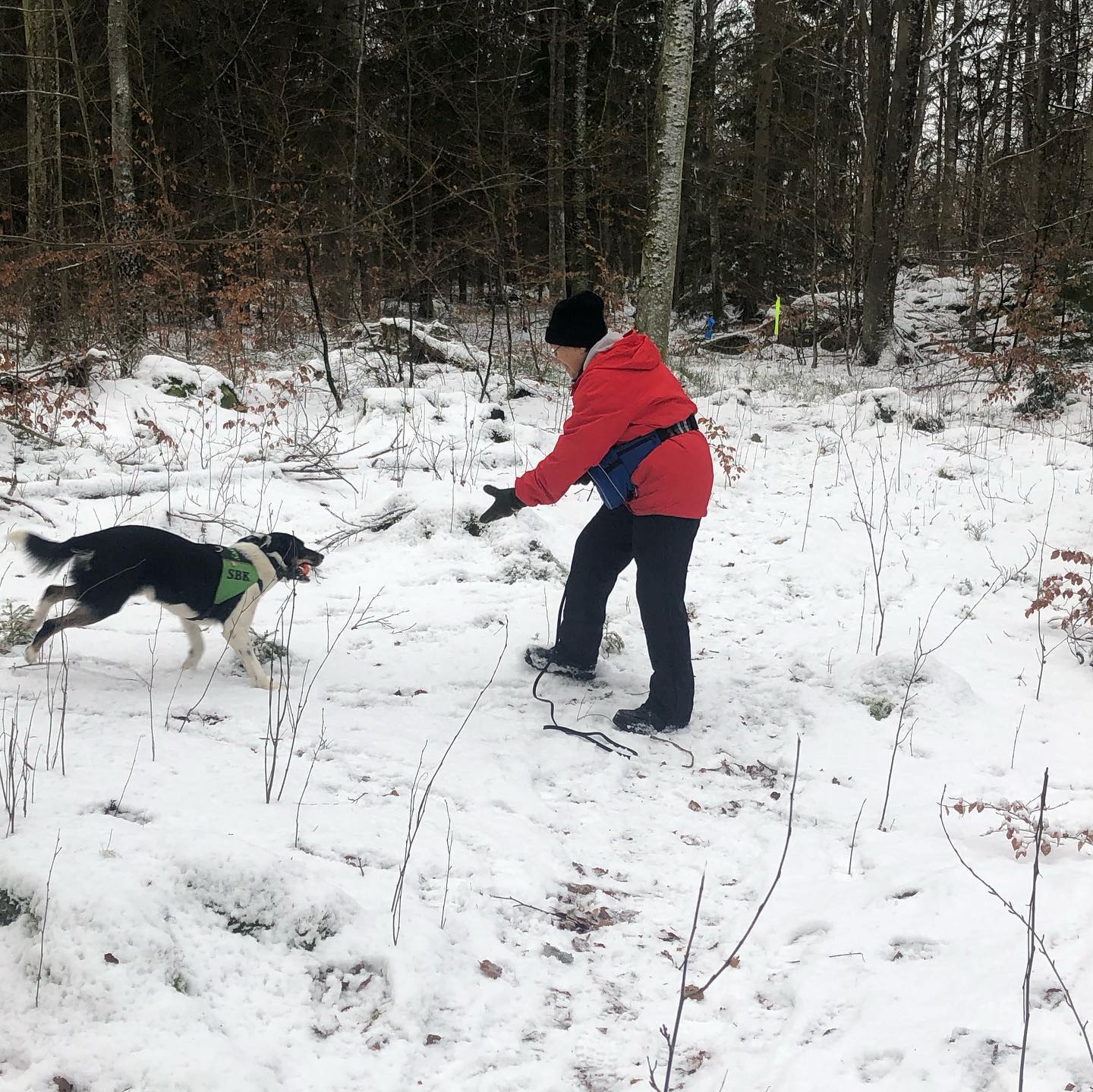 | 17/1 2021 tränar Inki och Prio sök. Prio kommer med sökrullen... | ... och påvisar figuranten fint! |