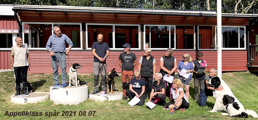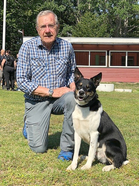 | Roland och Prio poserar efter appellklasstävlingen | Inki och Prio tävlade i Sölvesborg 14/11 2021 i lägre klass sök. Det blev uppflyttning och vinst på 524,25 p. Nu är Prio i högre klass både i spår och sök! |