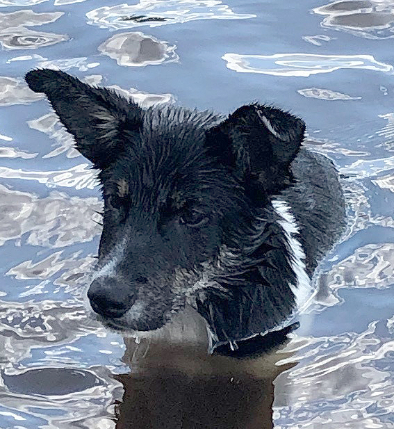 ... och vem tar den? Yksi förstås... med ålderns rätt kanske... de andra fick andra pinnar att simma ut och hämta. Utom Reggie - hon bara simmar ändå... hon gillar vatten. |