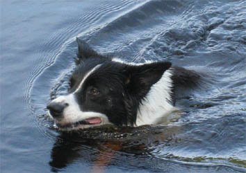 Några dagar senare simmar Zelo ut och hämtar en pinne | ... eller så bara simmar han ... skönt. |